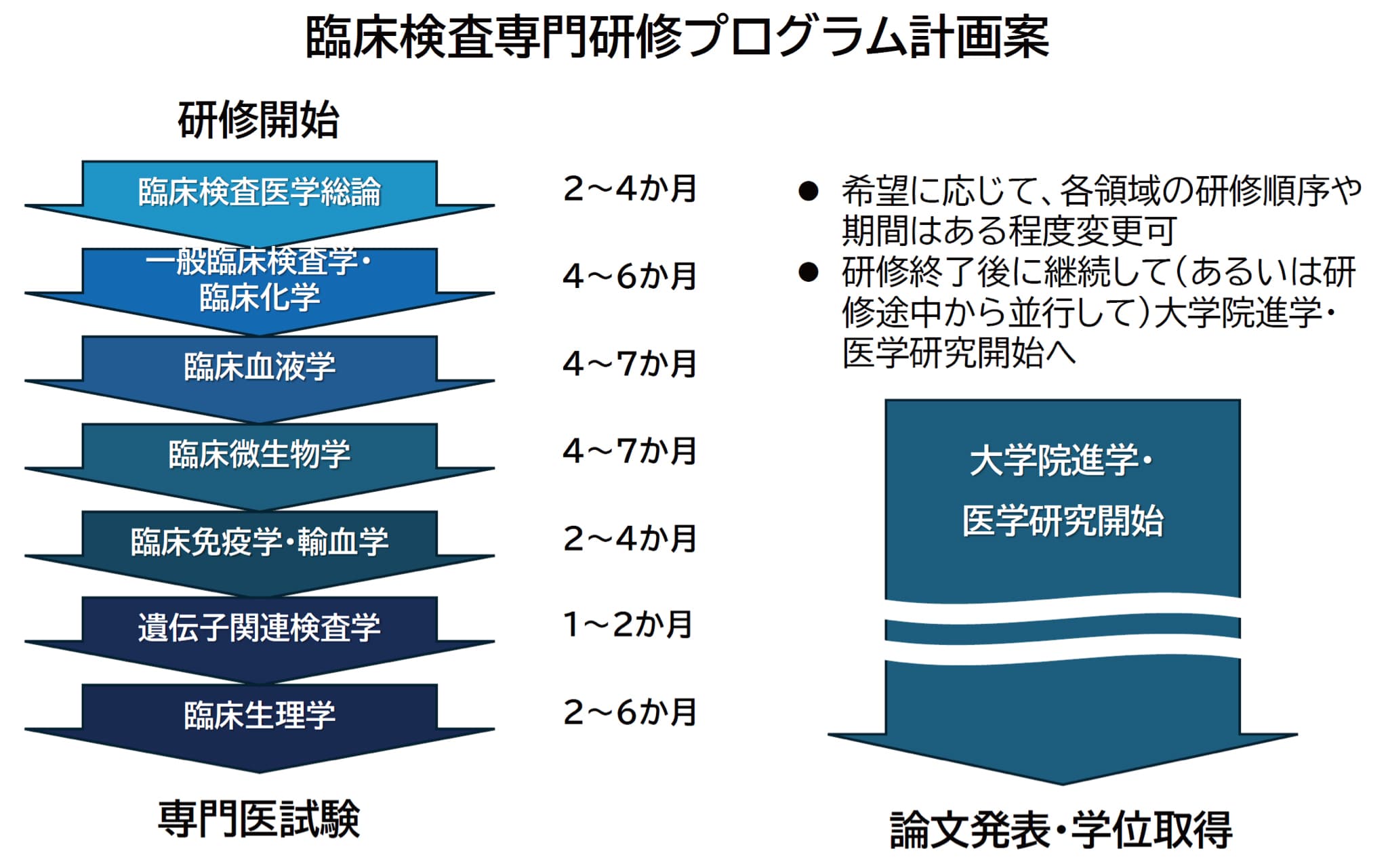 研修では検査プロセスから結果の解釈、精度管理まで全般を学ぶことができ、専門医取得と検査室の管理・指導が行えるレベルまでの到達を目標としています。超音波専門医、臨床遺伝専門医、人間ドック健診専門医などを目指した、さらに専門的な研修も可能ですし、大学院進学・医学研究を連続(または並行)して進めたいという方にも向いています。